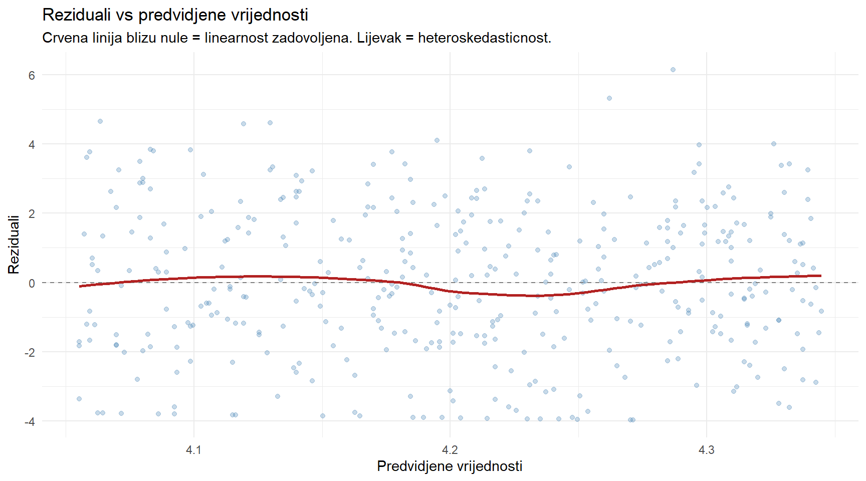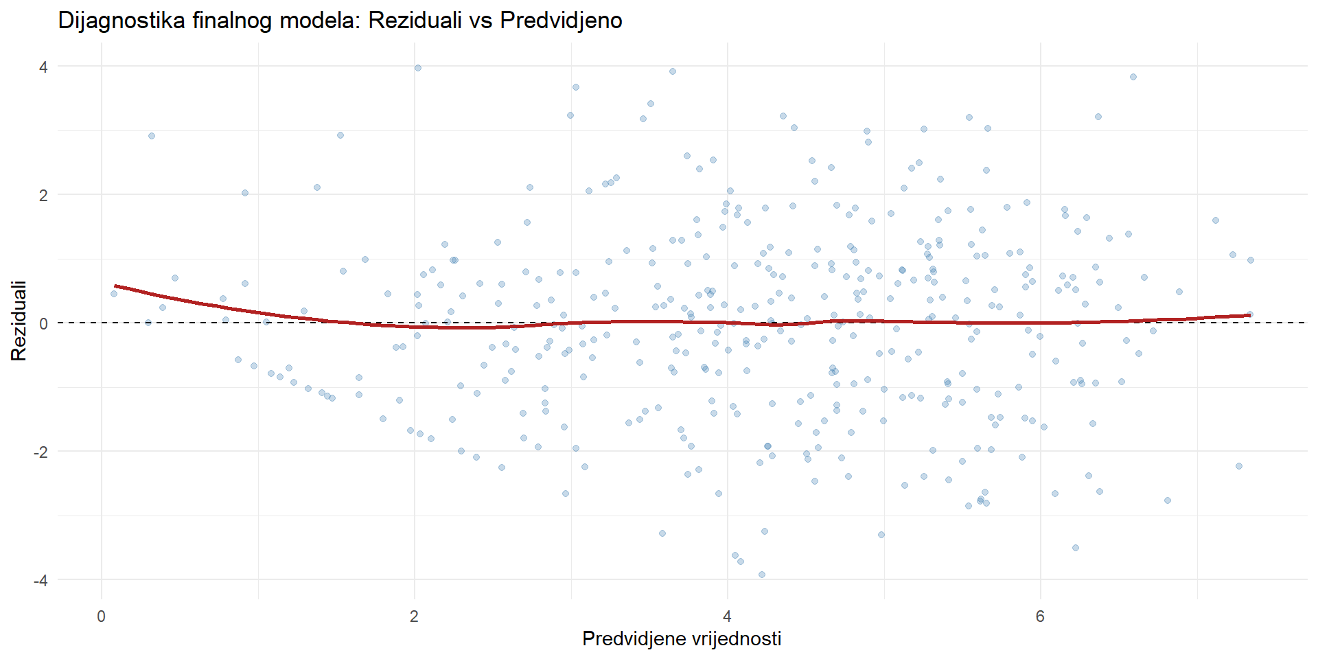 " (", round(r2_final * 100, 1), "% varijabilnosti objasnjeno)\n\n", sep = "") Prilagodeni R² = 0.493 (49.3% varijabilnosti objasnjeno)