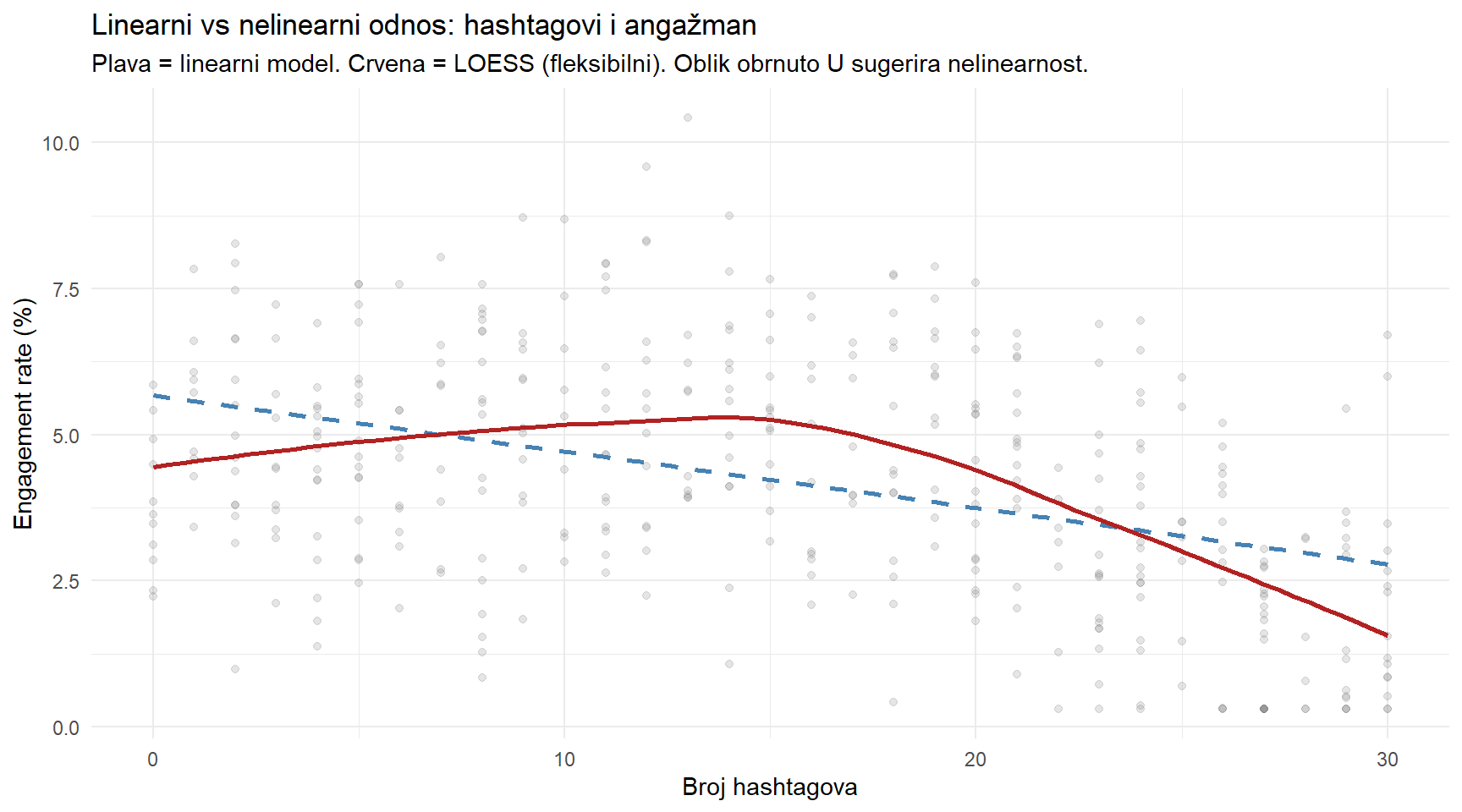 Jedna stvar vas možda brine. Negativna korelacija sugerira da više hashtagova znači niži angažman. Ali budite oprezni s takvim zaključcima. Možda veza uopće nije linearna — možda postoji optimalan broj hashtagova, a i premalo i previše je loše. Možda profili s više hashtagova imaju i druge karakteristike koje snižavaju angažman. To su pitanja koja ćemo istražiti kasnije u ovom predavanju.