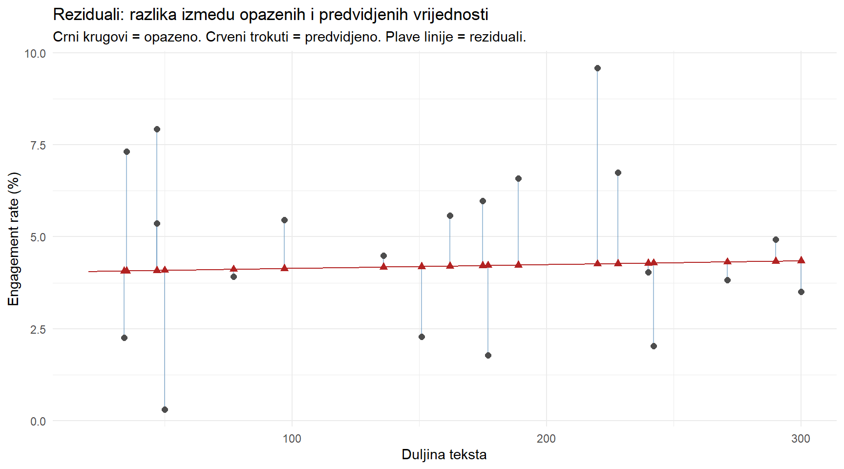 cat("Interpretacija:", round(r2 * 100, 1), "% varijabilnosti u engagement rateu\n")Interpretacija: 0.2 % varijabilnosti u engagement rateu