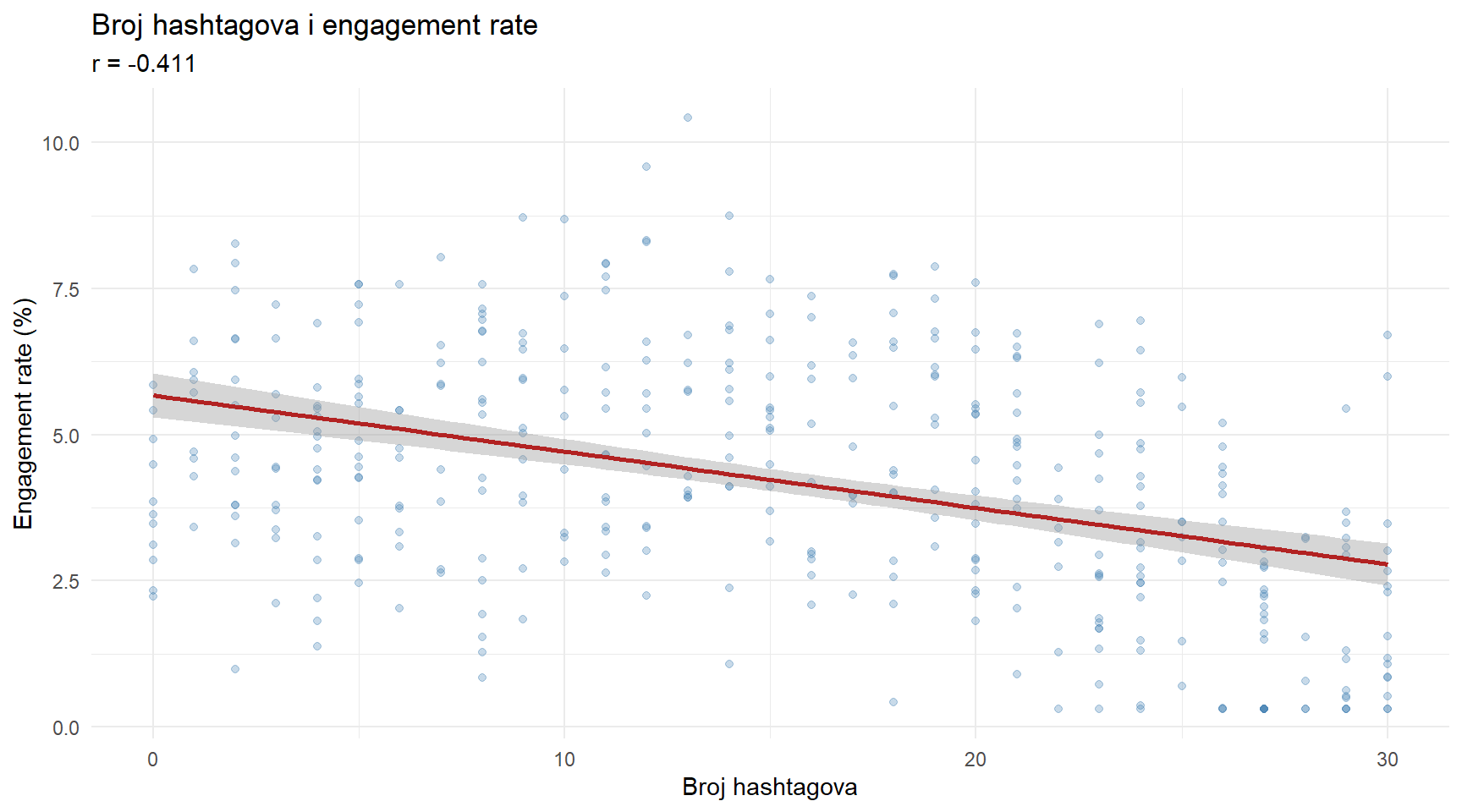 Pogledajte stupac engagement_rate. Broj hashtagova ima negativnu korelaciju s angažmanom (r ≈ -0.41), što znači da objave s više hashtagova u prosjeku imaju niži engagement rate. Vizualizirajmo tu vezu.
